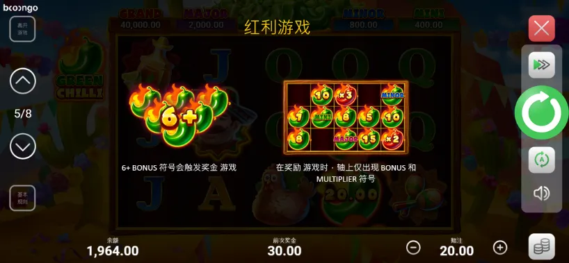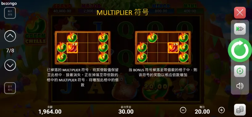 - 當綠色辣椒(BONUS)掉落在格子中,該符號獎勵以相對倍數增加。