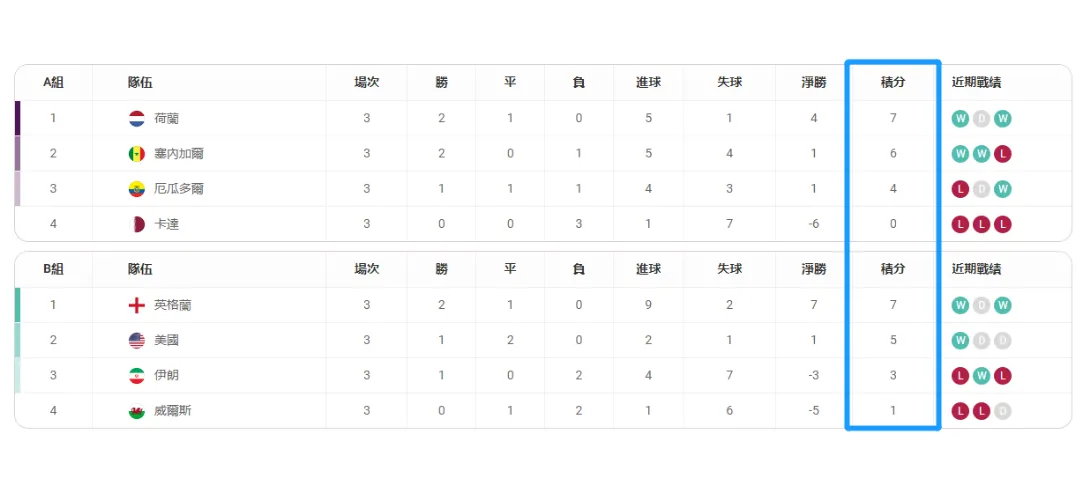 2022世界盃積分榜