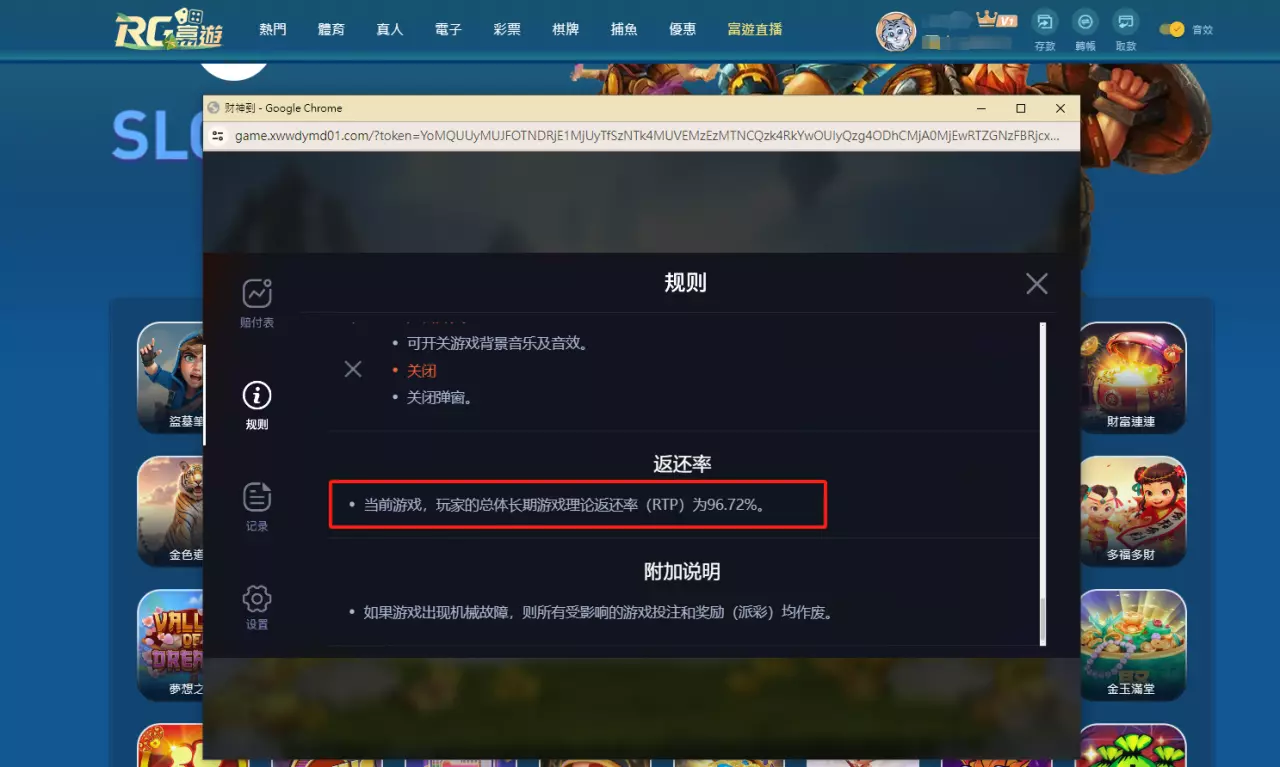 大多數線上娛樂城會在遊戲說明或規則中標示 RTP。通常會在遊戲介面的某個角落,或是在遊戲的幫助頁面中找到。下圖用富遊娛樂城的DB電子為例 :