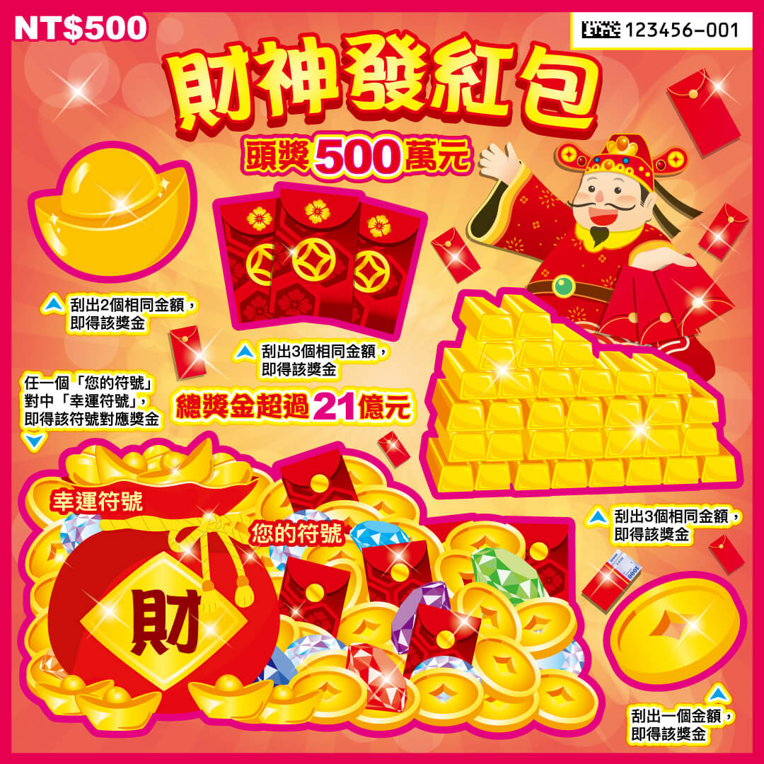《財神發紅包》頭獎500萬元,總獎金超過21億元。以下是財神發紅包刮刮樂資訊: