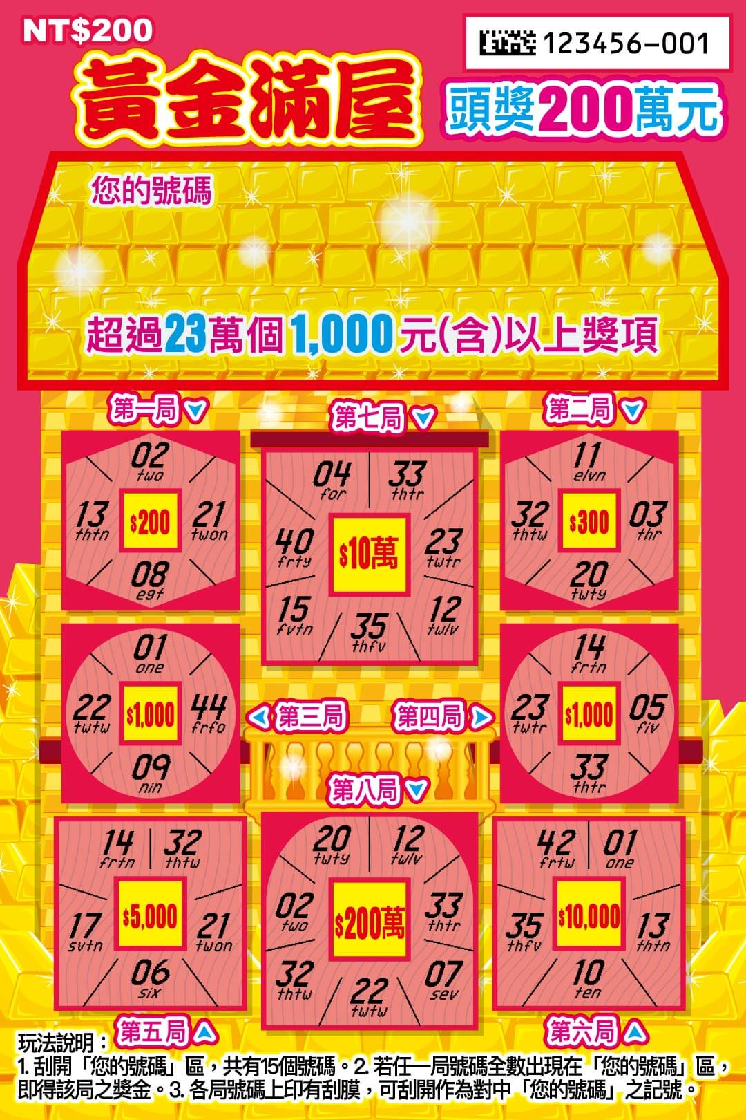 《黃金滿屋》頭獎200萬元,超過23萬個1,000元(含)以上獎項。以下是黃金滿屋刮刮樂資訊: