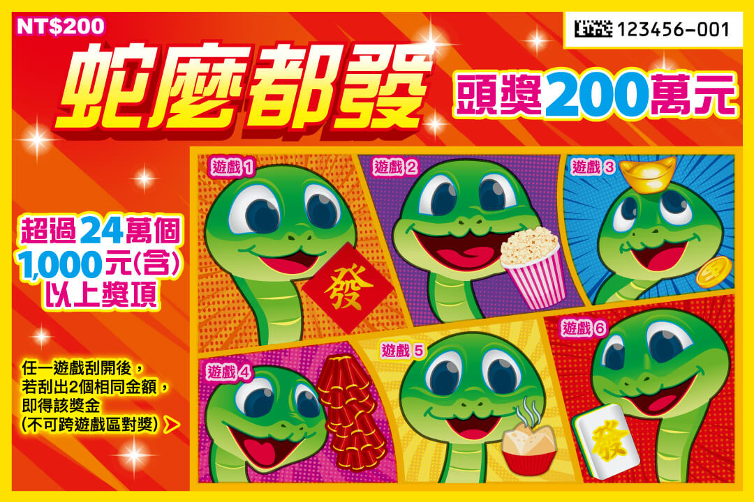 《蛇麼都發》頭獎200萬元,超過24萬個1,000元(含)以上獎項。以下是蛇麼都發刮刮樂資訊: