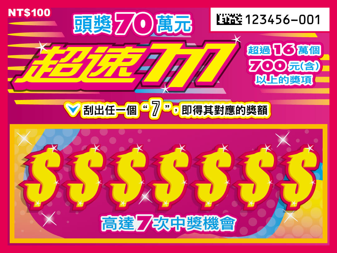 《超速777》頭獎70萬元,超過16萬個700元(含)以上的獎項,高達7次中獎機會。以下是超速777刮刮樂資訊: