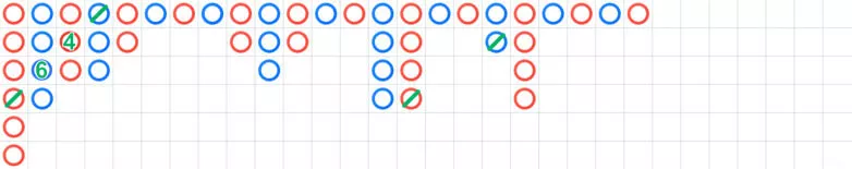 以大路最新結果為換列,對比前1列與前3列,如結果位置不齊整則小路畫藍點。如結果為齊整,則小路畫紅點。在小路中不會出現和局的體現,當新一局結果為和局時,小路無變化(不出現紅點或藍點)。